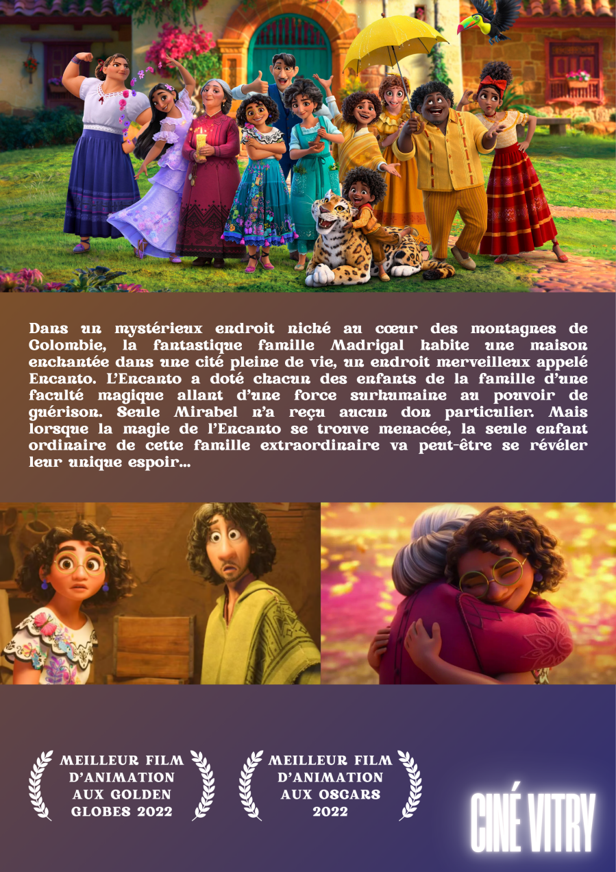Dans un mystérieux endroit niché au cœur des montagnes de Colombie, la fantastique famille Madrigal habite une maison enchantée dans une cité pleine de vie, un endroit merveilleux appelé Encanto. L’Encanto a doté chacun des enfants de la famille d’une faculté magique allant d’une force surhumaine au pouvoir de guérison. Seule Mirabel n’a reçu aucun don particulier. Mais lorsque la magie de l’Encanto se trouve menacée, la seule enfant ordinaire de cette famille extraordinaire va peut-être se révéler leur unique espoir…