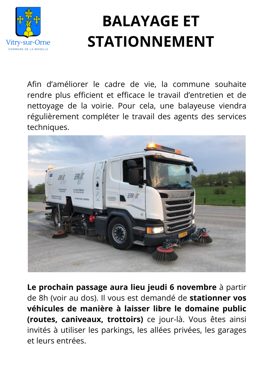 Prière de stationner vos véhicules de manière à laisser libre le domaine public (routes, caniveaux, trottoirs) le jeudi 6 novembre.