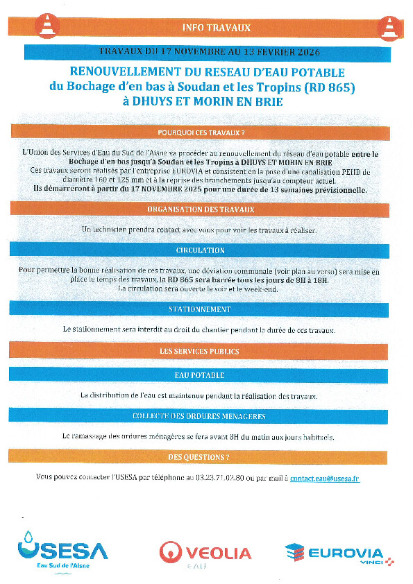 En raison du remplacement des canalisations d'eau potable la route de Soudan sera barrée et interdite à la circulation dès demain Mercredi 03 décembre 2025.