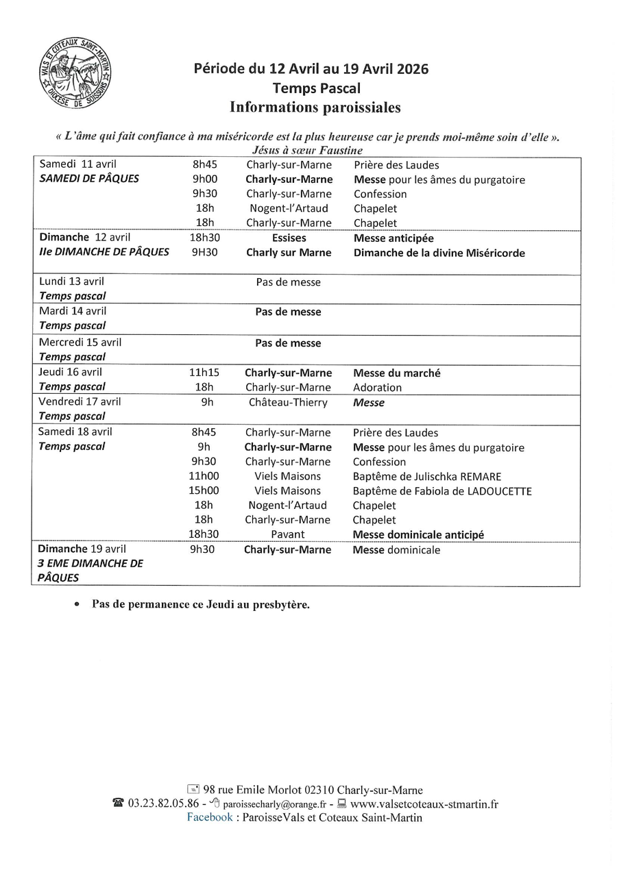 Informations paroissiales - Période du 12 au 19 Avril 2026