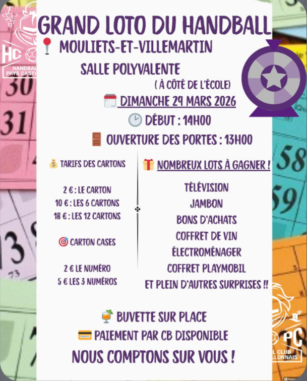 Venez passer une soirée conviviale et chaleureuse autour d'un grand loto organisé par les bénévoles au profit du club de hand-ball de mouliets et villemartin