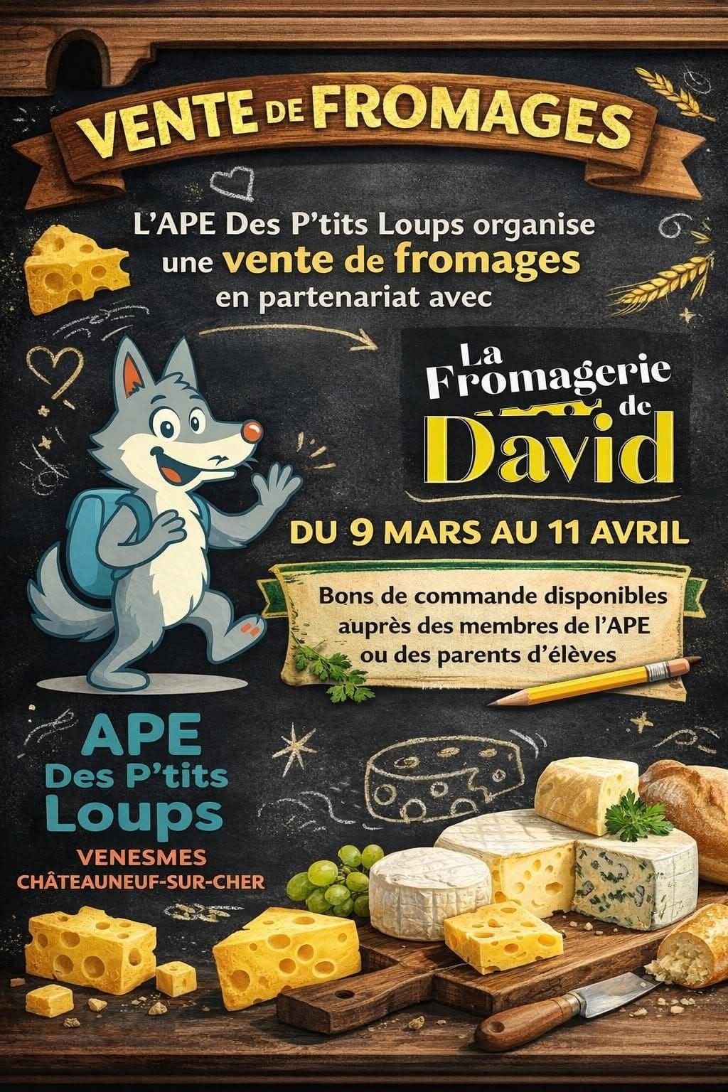 À partir de 𝗟𝘂𝗻𝗱𝗶 9 𝗠𝗮𝗿𝘀 2026, L'APE Des P'tits Loups organise en partenariat avec la 𝑭𝒓𝒐𝒎𝒂𝒈𝒆𝒓𝒊𝒆 𝒅𝒆 𝑫𝒂𝒗𝒊𝒅 , Une vente de fromages.