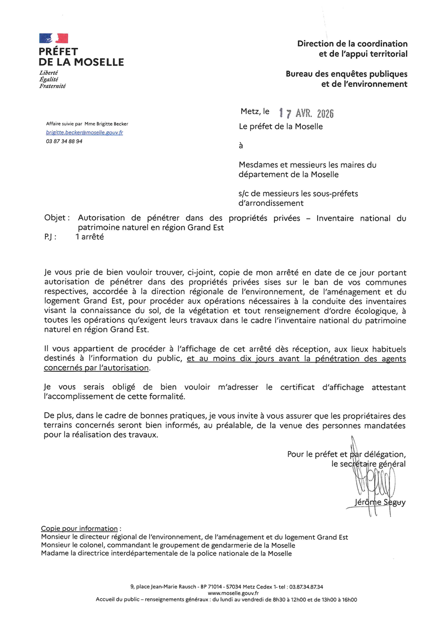 ci-joint, un arrêté d'autorisation de pénétrer dans des propriétés privées au profit de la DREAL dans le cadre de la réalisation de l'inventaire national du patrimoine naturel en région Grand Est.