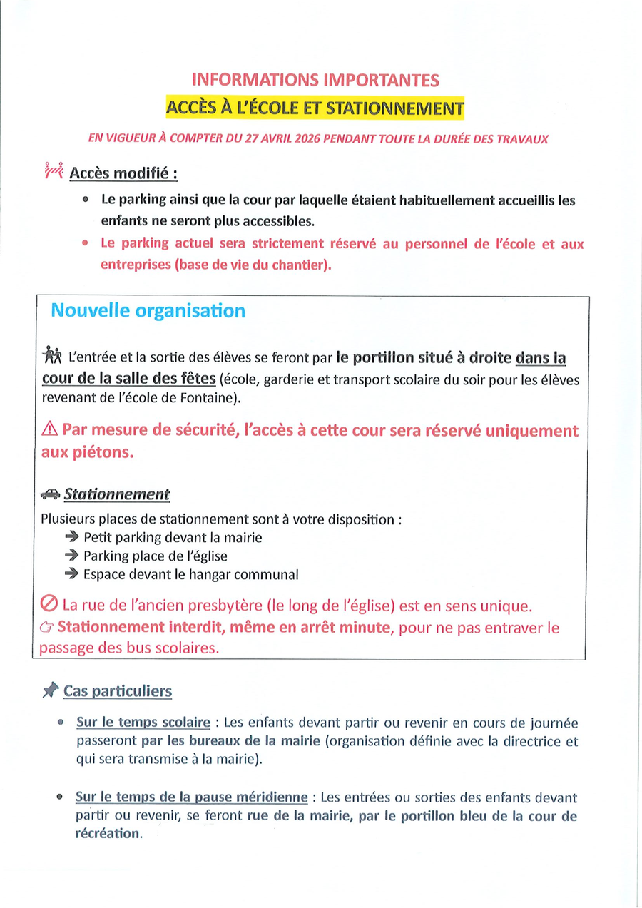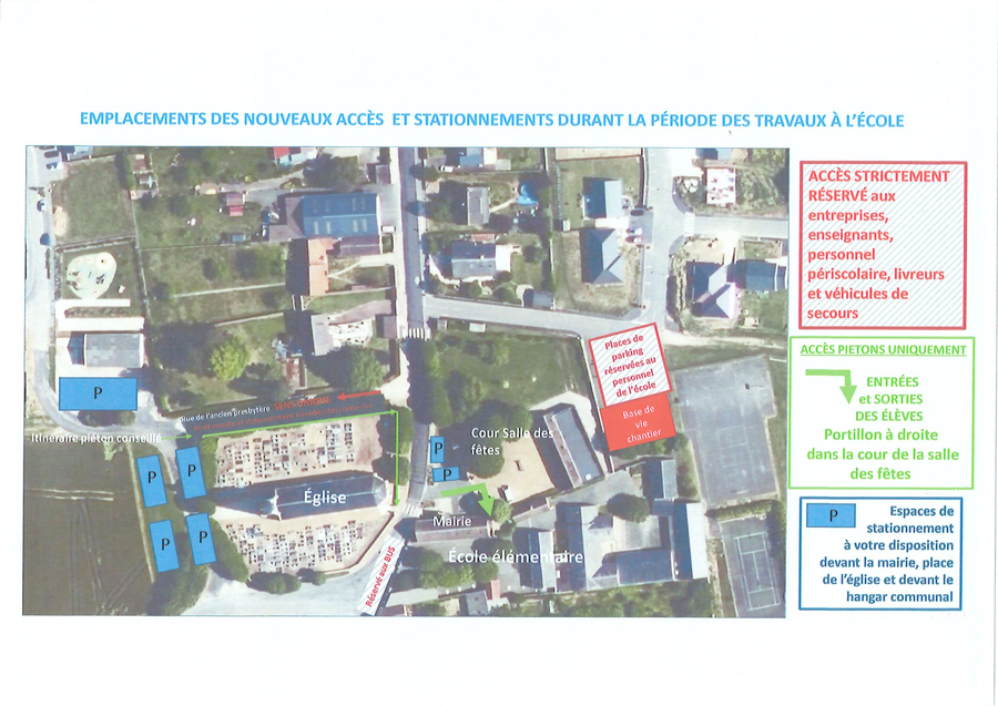 Vous trouverez ci-dessous les informations pour accéder à l'école pendant les travaux de son agrandissement (à compter du retour des vacances de Pâques), et un plan pour faciliter l'accès et le stationnement.