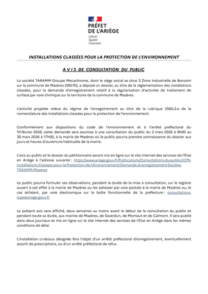 sur la demande d'enregistrement présentée par la société TARAMM - Groupe Mecachrome relative à la régularisation d'activités de traitement de surface par voie chimique sur le territoire de la commune de Mazères