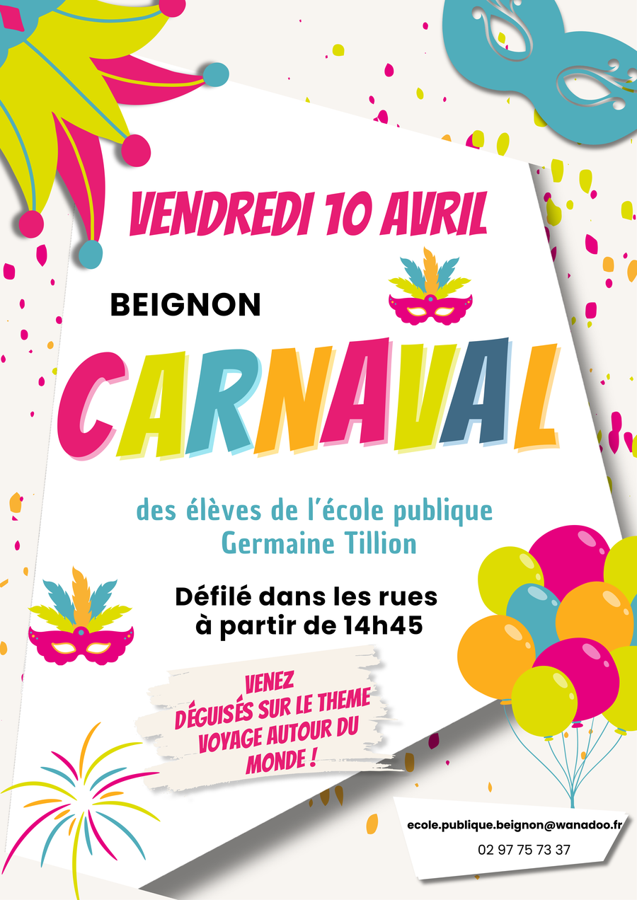 Le carnaval de l'école Germaine Tillion de Beignon aura lieu le vendredi 10 avril à partir de 14h45 dans les rues de Beignon