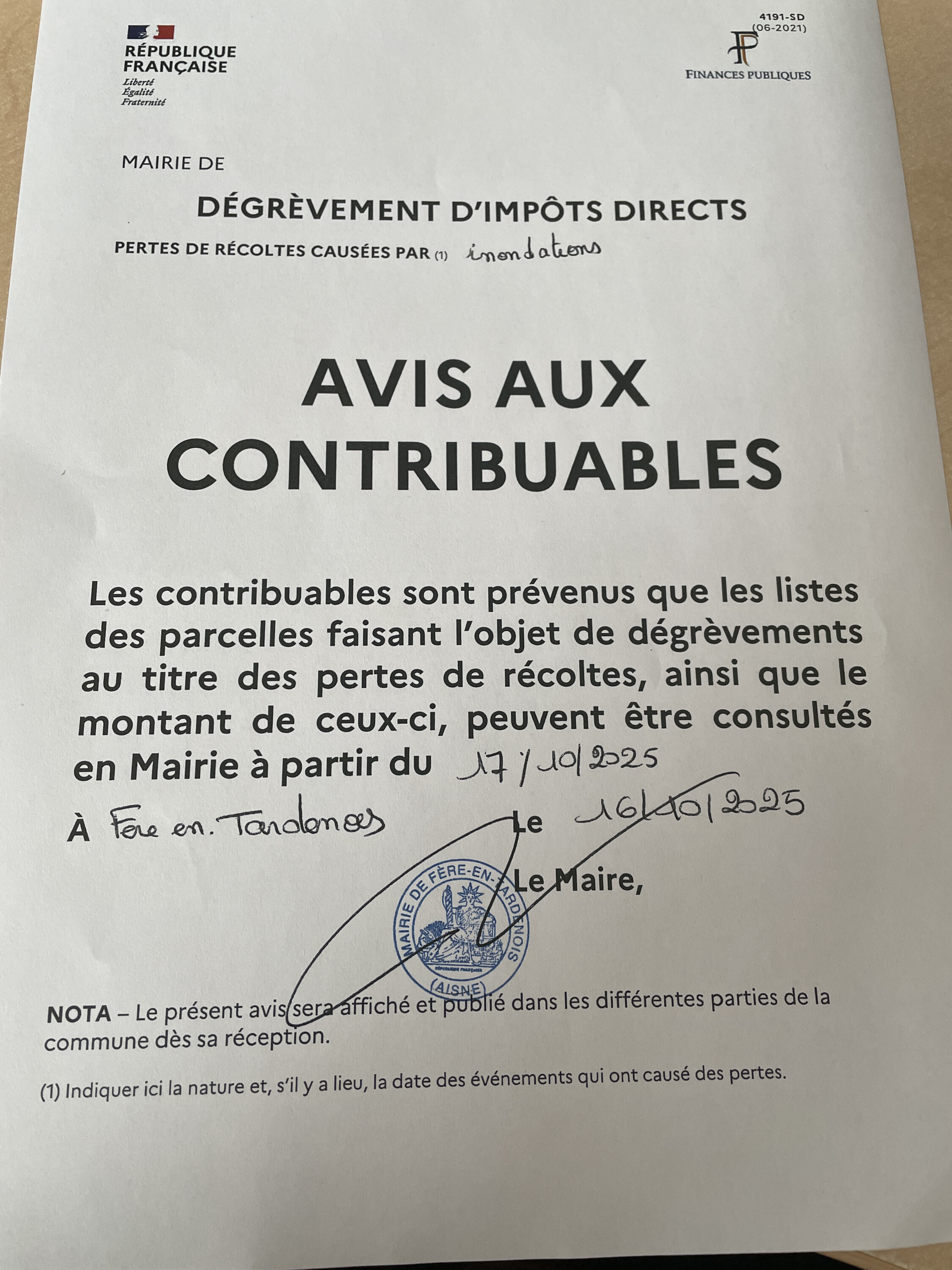 La mairie de Fère-en-Tardenois informe les contribuables que la liste des parcelles concernées par un dégrèvement d’impôts en raison des pertes de récoltes dues aux inondations peut être consultée en mairie à partir du 17 octobre 2025.