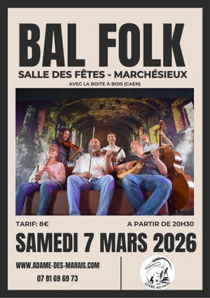 Dans la continuité de l'assemblée générale, l'Adame organise un BAL FOLK avec le groupe La Boite à Bois (14) à la salle des fêtes de Marchésieux à partir de 20h30 ce samedi 7 mars.