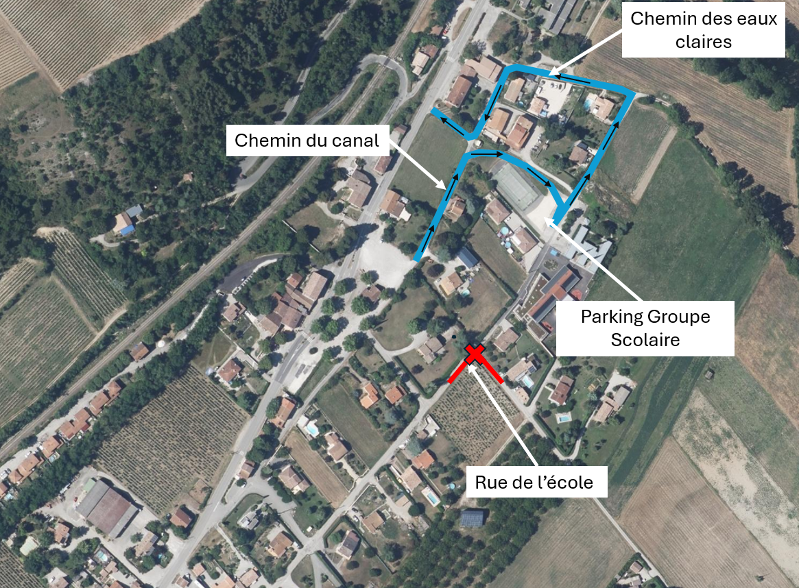 Fermeture de la Rue de l’École (dans les deux sens) à compter du 20 avril 2026 au niveau du carrefour du chemin de la Drôme (voir tracé en rouge sur le plan joint).