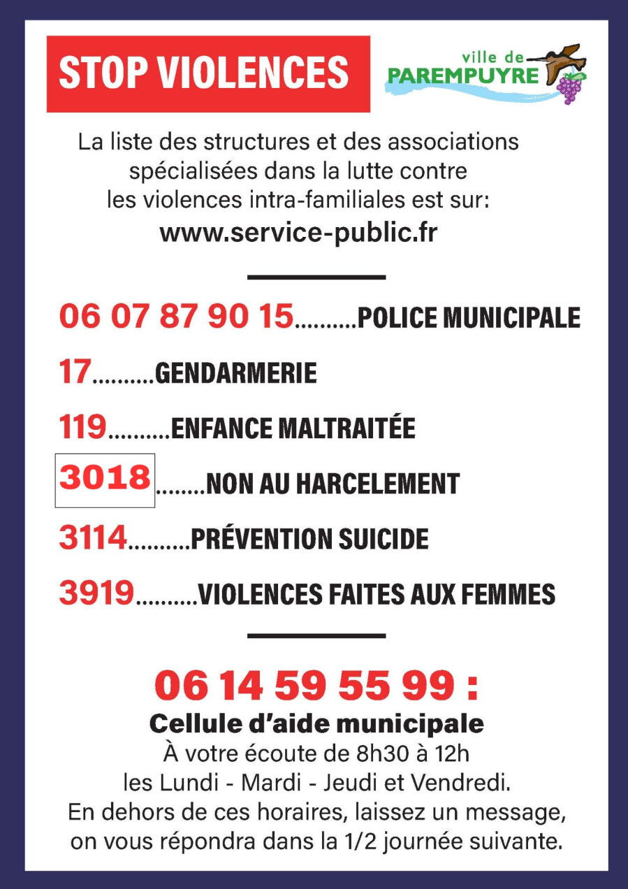 Si vous en subissez, ou si vous avez connaissance de tels agissements composez le numéro dédié par la Ville 06 14 59 55 99 pour prendre contact avec la cellule d’aide aux victimes de Parempuyre.