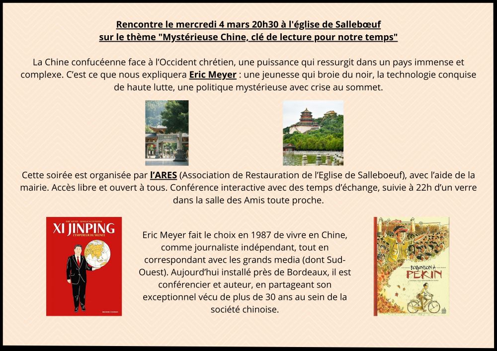 L’ARES (Association de Restauration de l’Église de Sallebœuf) organise une rencontre-débat consacrée à la Chine contemporaine.