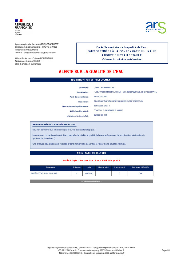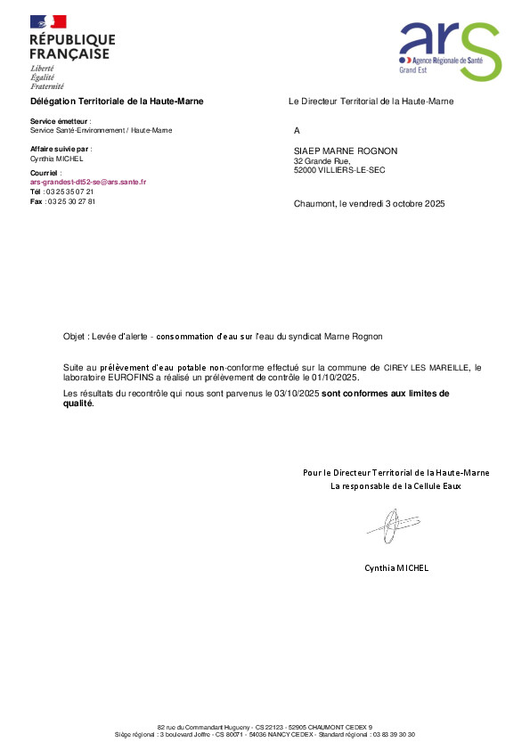 Suite aux deux analyses d'eau réalisées mercerdi 01/10/2025 matin sur les Communes de Cirey les Mareilles et le Puits des Mèzes, l'ARS a levé l'alerte