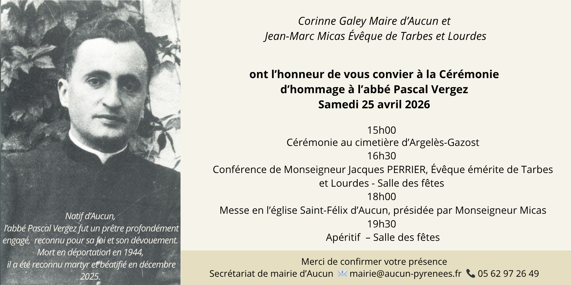 Corinne GALEY, Maire d’Aucun, et Monseigneur Jean-Marc MICAS, Évêque de Tarbes et Lourdes, ont l’honneur de vous convier à la :