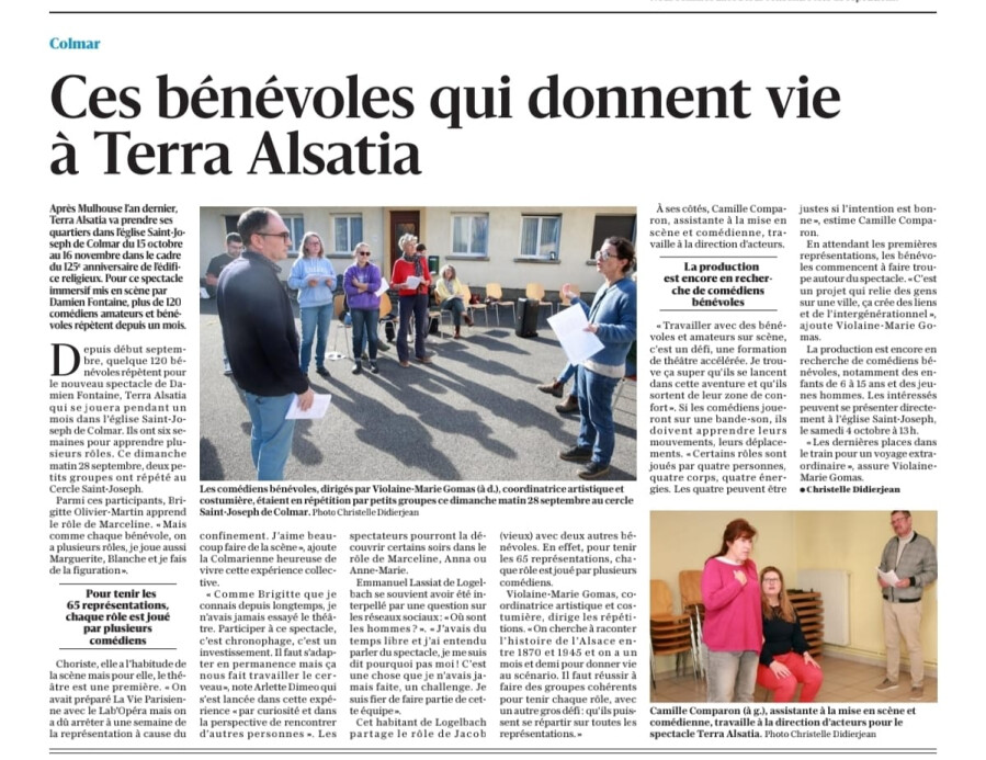 Pour la prochaine édition du spectacle immersif et monumental Terra Alsatia (15 octobre - 16 novembre 2025) à l'Église Saint-Joseph de Colmar, nous avons besoin de votre aide pour créer une immersion totale dans l'histoire alsacienne de 1870 à 1945.