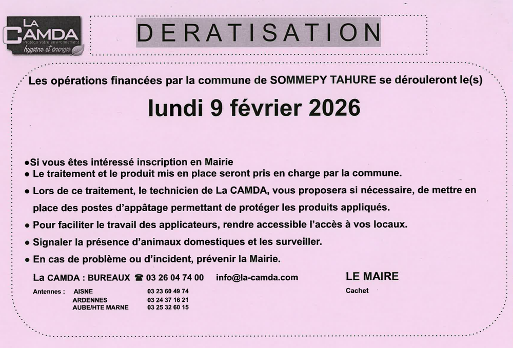 Merci de vous inscrire en mairie avant le 5 février pour demander le passage du technicien pour réaliser la dératisation dans vos locaux.