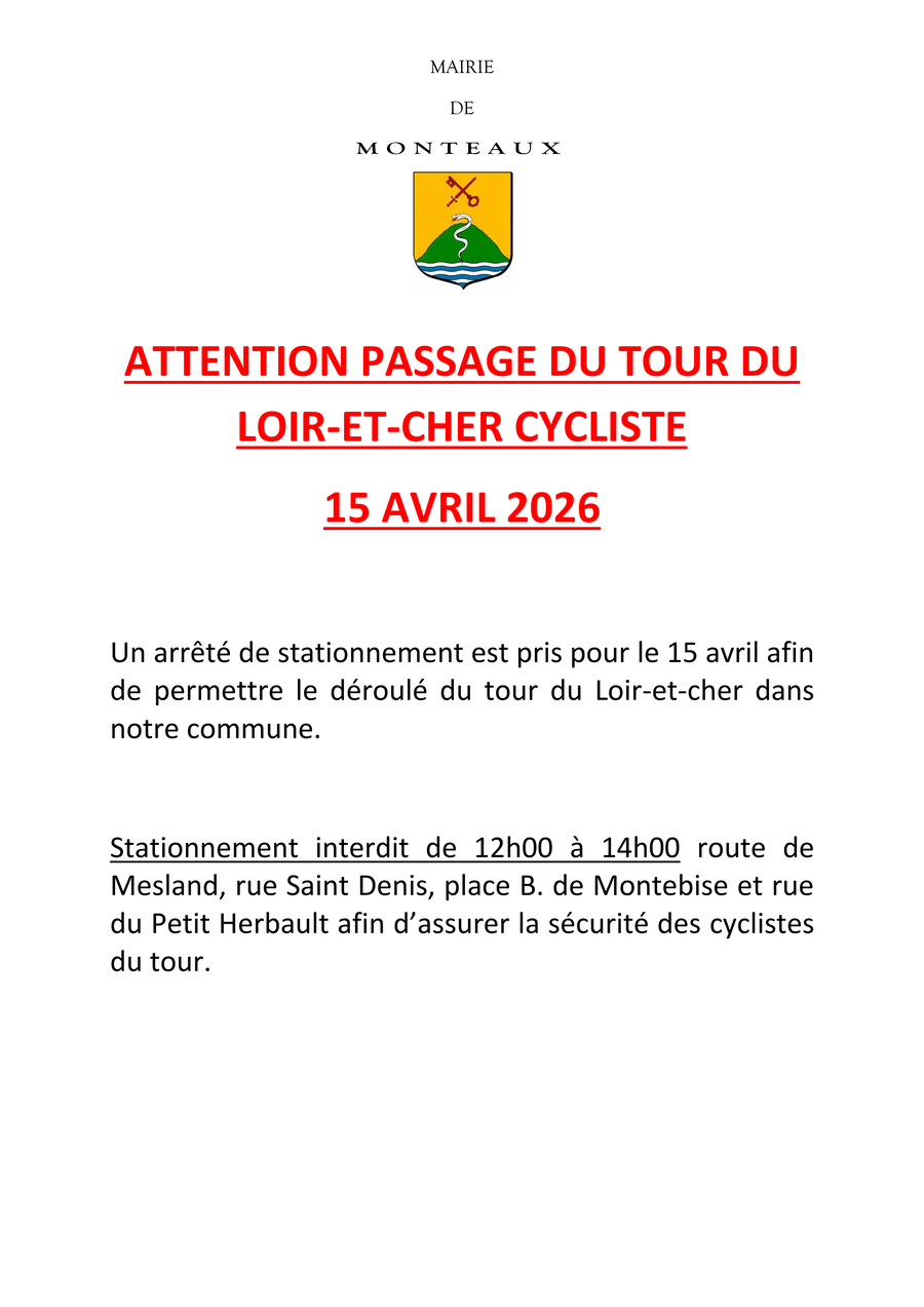 Le tour du Loir-et-Cher cycliste traversera la commune de Monteaux le 15 avril entre 12h30 et 13h00, en provenance de Mesland et en direction de Veuzain-sur-Loire.