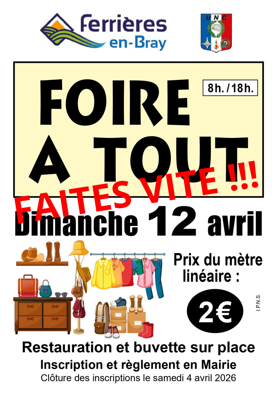 Les inscriptions pour la prochaine foire à tout se feront directement en mairie, à partir du 16 mars 2026.