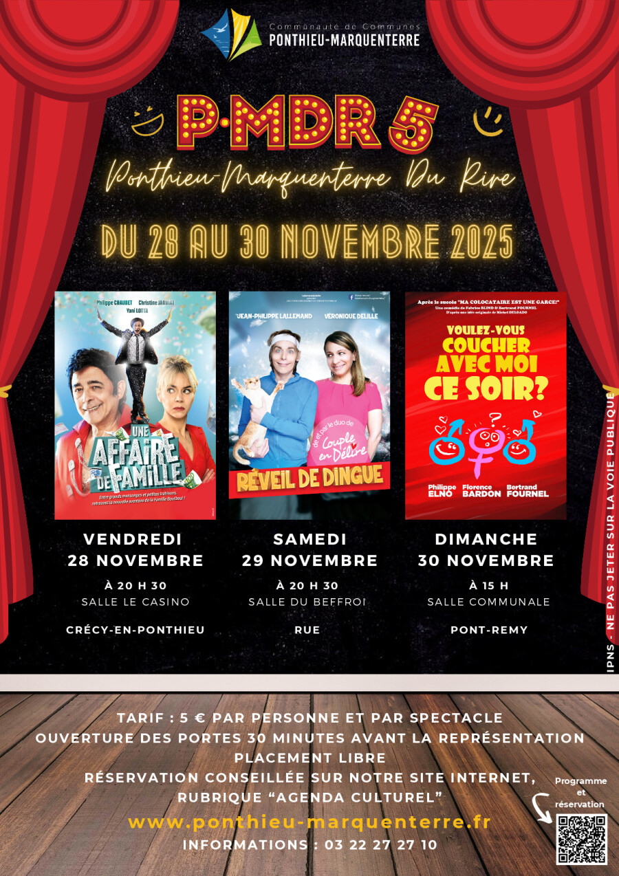 Le festival d’humour de la Communauté de communes revient pour sa 5e édition ! Le Ponthieu-Marquenterre du Rire c’est : trois comédies, trois jours consécutifs, dans trois salles du territoire.