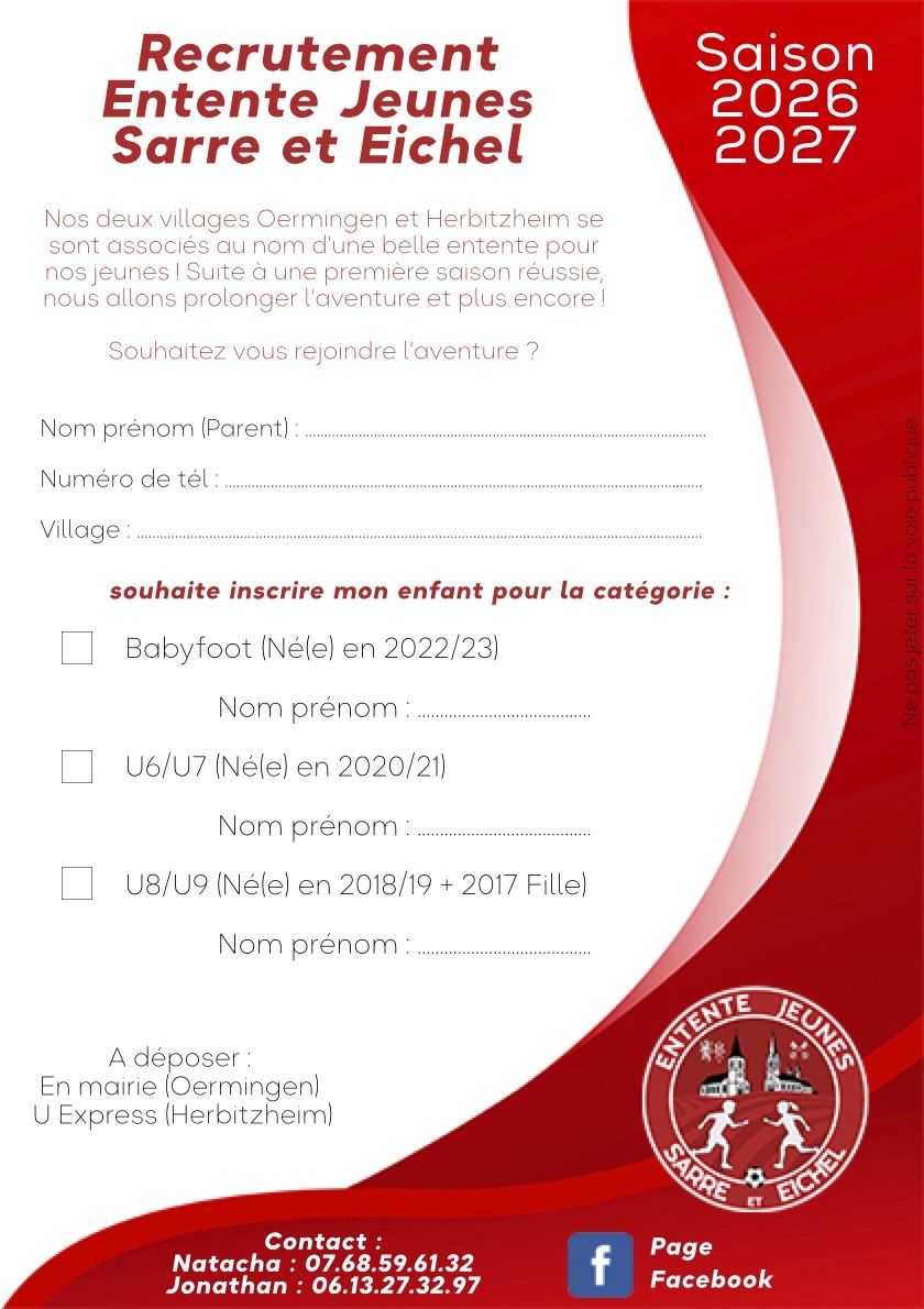 L’Entente Jeunes Sarre et Eichel (Oermingen + Herbitzheim) prolonge son succès et ouvre à nouveau les inscriptions pour les jeunes footballeurs et footballeuses.