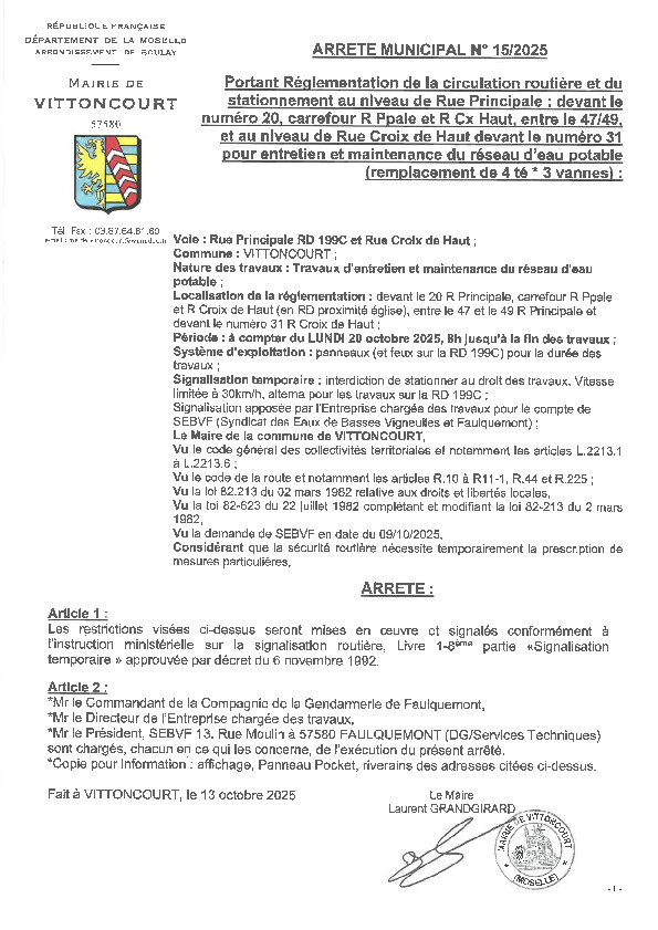 Nous vous prions de prendre connaissance de l'arrêté municipal de circulation 15/2025 ci-joint et relatif à l'autorisation de travaux à venir (début : 20/10/2025) sur le réseau d'eau potable.