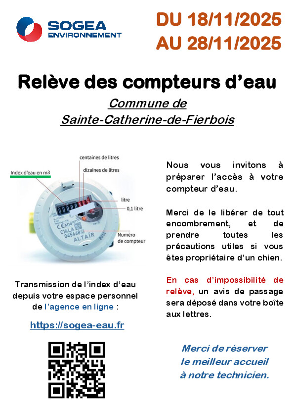 SOGEA passera faire les relevés de compteurs d'eau entre le 18/11/2025 et le 28/11/2025.