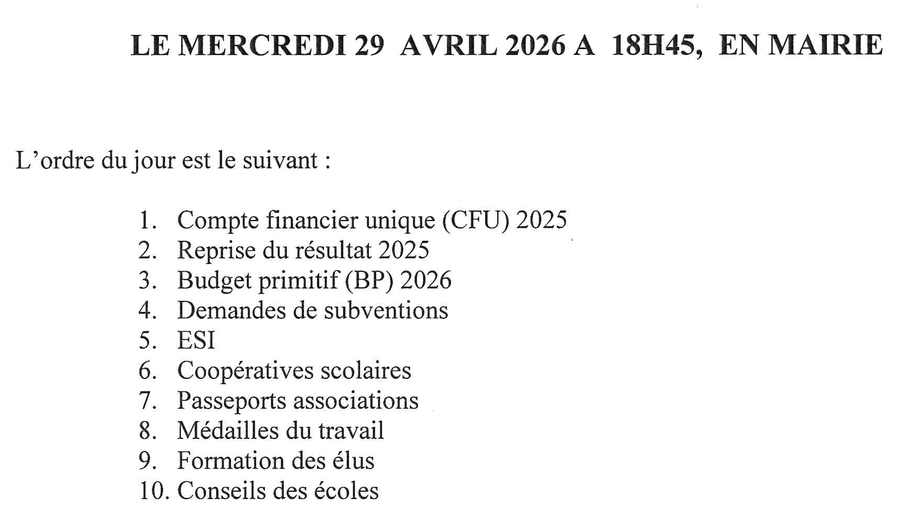 Le prochain conseil municipal aura lieu le mercredi 29 avril à 18h45 en Mairie, salle du Conseil.