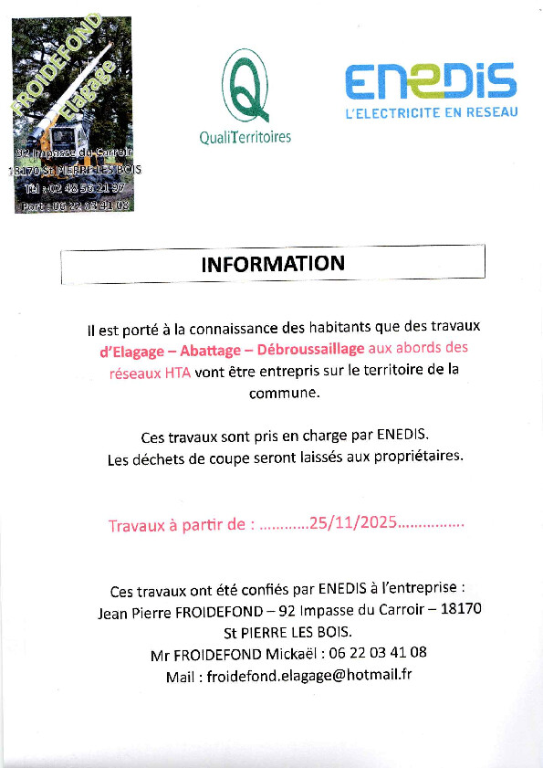 Travaux d'élagage à compter du 25/11/2025 sur le territoire de la commune de Saint-Loup-des-Chaumes exécutés pour le compte d'ENEDIS