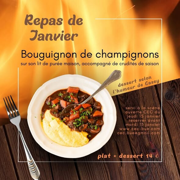 Repas maison : bourguignon de champignons, sur son lit de purée maison, accompagné de crudités de saison, et dessert maison selon l'humeur de Casey. 14€, réserver avant le mardi 13, par e-mail ou sur le site. Servi à partir de 20h.