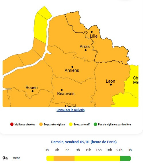 En lien avec le passage de la tempête "GORETTI" qui circulera de la Manche vers le Benelux, dès ce soir, les rafales de vent, de secteur sud à sud-ouest gagnent rapidement en intensité et se généralisent rapidement à l'ensemble de la région en seconde partie de nuit, avant de faiblir progressivement ce vendredi.