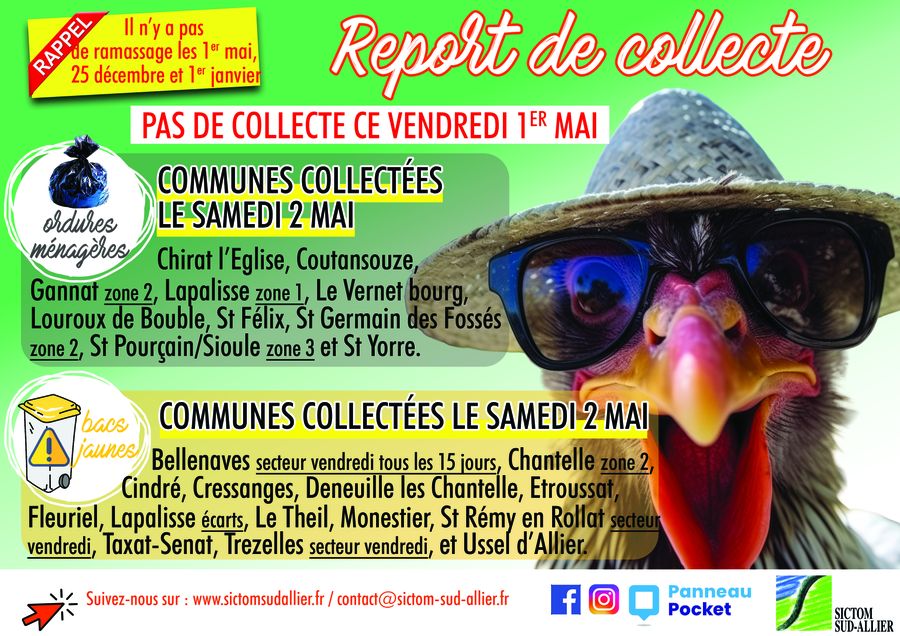 Les reports sont effectués SAMEDI 2 MAI et nos déchetteries seront ouvertes.