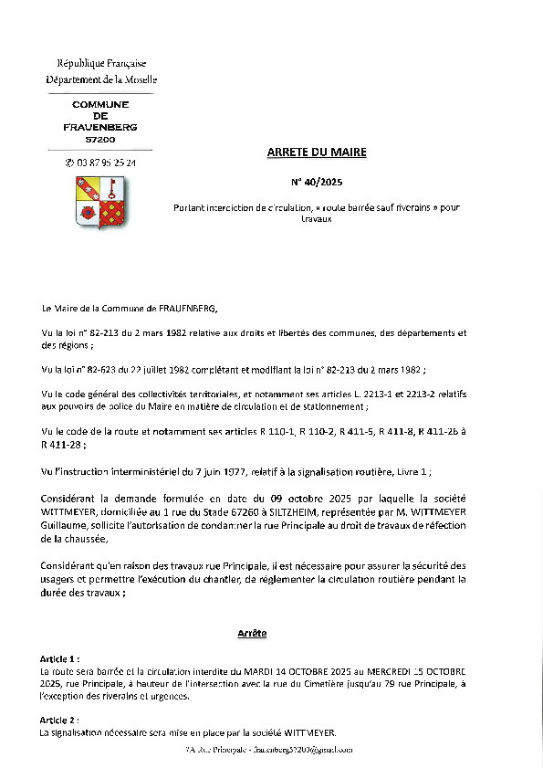 Du mardi 14/10/2025 8h au mercredi 15/10/2025 18h , la rue Principale sera interdite à la circulation sauf riverains et urgence.