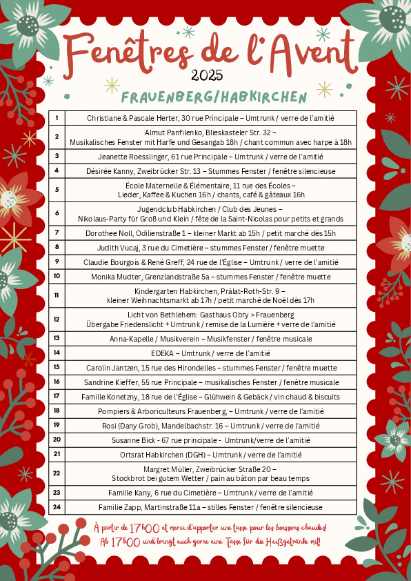 Le concept demeure inchangĂ© : chaque jour de l'Avent, une fenĂȘtre joliment dĂ©corĂ©e s'ouvrira Ă Frauenberg ou Ă Habkirchen, apportant ainsi un peu plus de magie dans l'attente de NoĂ«l. Ce format offre une expĂ©rience engageante et mĂ©morable de l'Avent, tout en consolidant les liens au sein de notre communautĂ©.