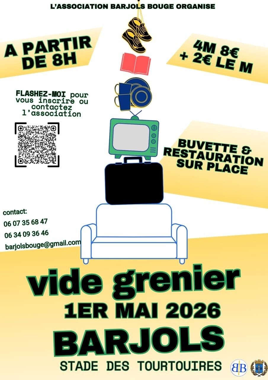 L'association Barjols Bouge vous invite à participer à son vide grenier le vendredi 1er mai 2026 à partir de 8h00 au Stade des Tourtouires !