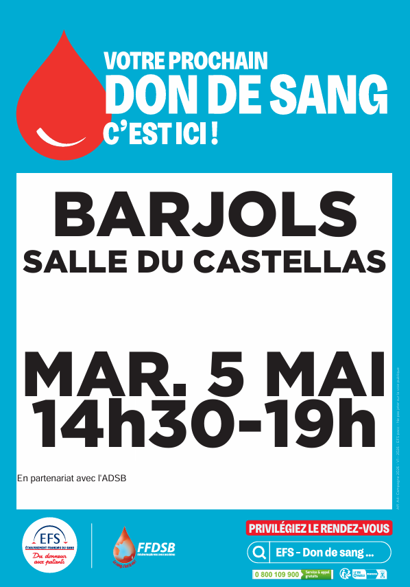 Rejoignez l’EFS le mardi 5 mai 2026 de 14h30 à 19h00 à la salle du Castellas de Barjols en prenant rendez-vous ici :