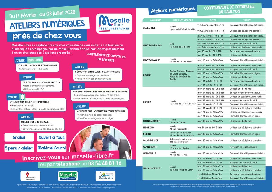C’est près de chez vous, c’est gratuit, c’est ouvert à tous et c’est limité à 5 personnes par atelier ! N’attendez plus : www.moselle-fibre.fr