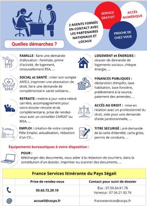 Afin de pouvoir optimiser et répartir l’appui de « FRANCE SERVICES » sur le territoire de Pays Ségali Communauté, vous trouverez ci-dessous le calendrier de la permanence sur notre commune le lundi matin à la Bibliothèque située au rez-de-chaussée de la Mairie. N’hésitez pas à prendre RDV en appelant le 05.65.72.29.19 ou le 07.50.64.91.78 pour vous aider dans vos démarches administratives dématérialisées (CAF, CARSAT, France EMPLOI, impôts, MSA, …).