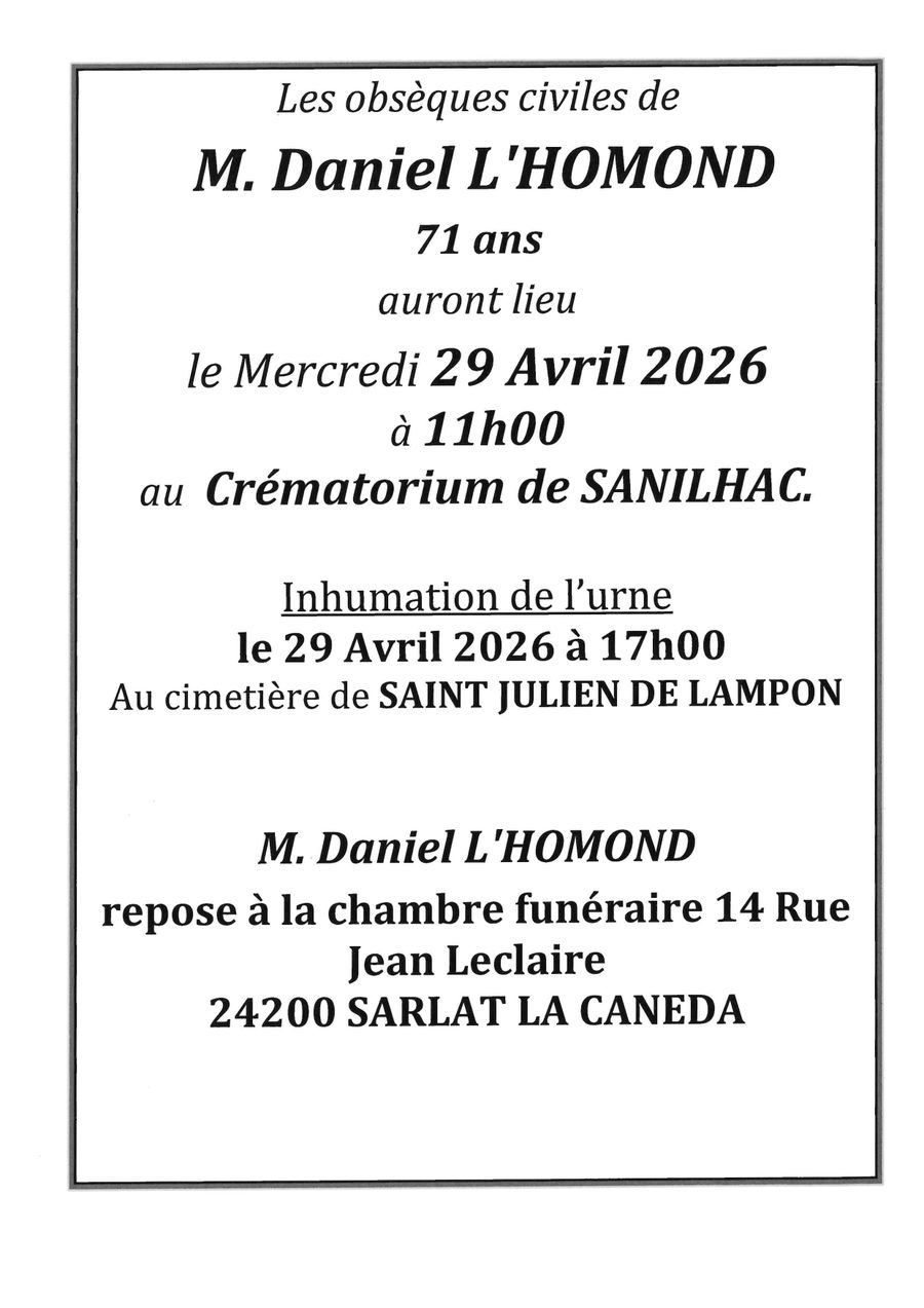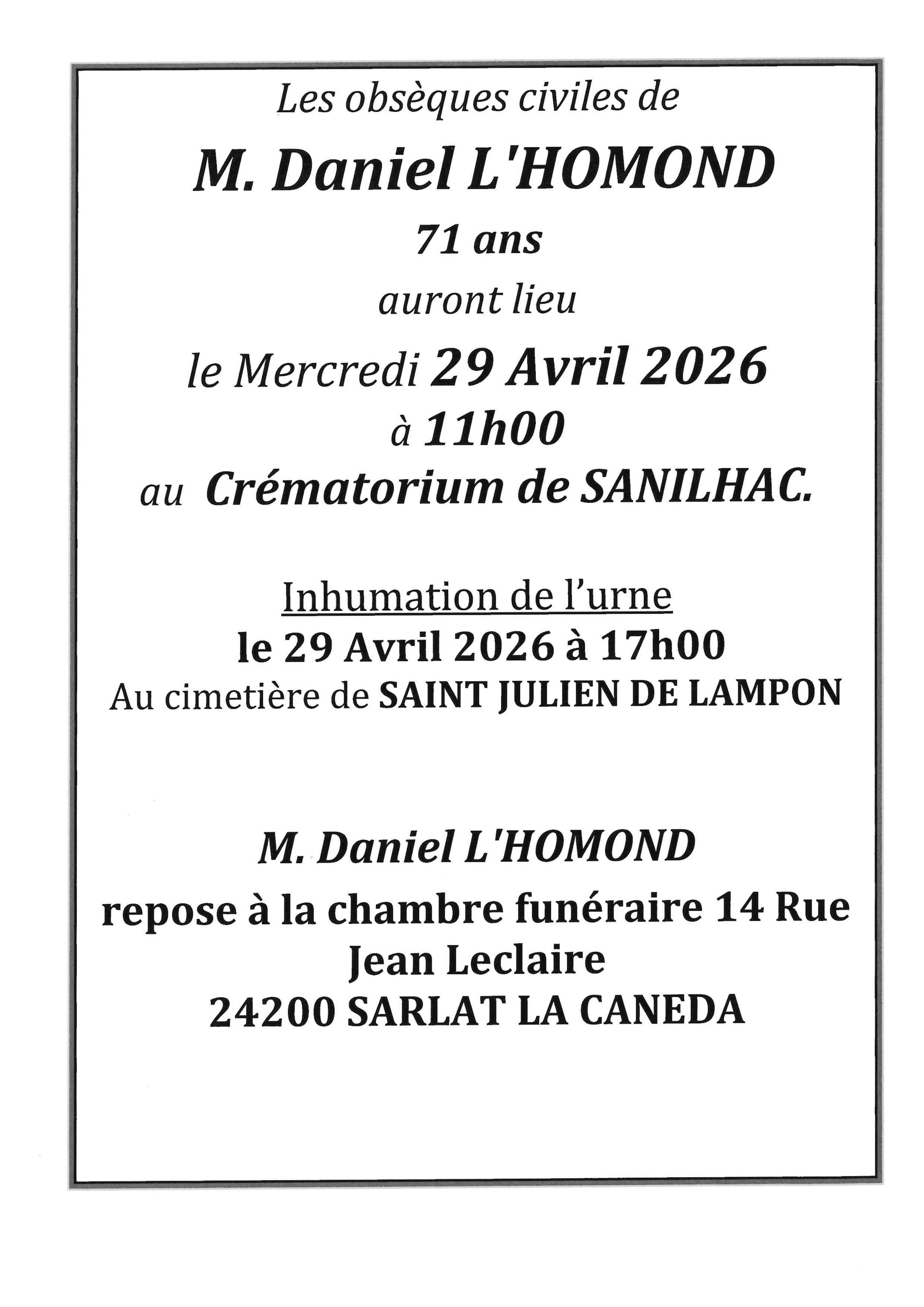 En raison des obsèques de Monsieur L'Homond, le conseil municipal prévu le mercredi 29 est déplacé au lundi 27 avril à 18h00.