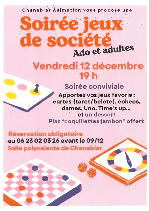 Jeux pour ados et adultes le *VENDREDI 12 Décembre à 19h00* à la salle polyvalente de Chenebier.