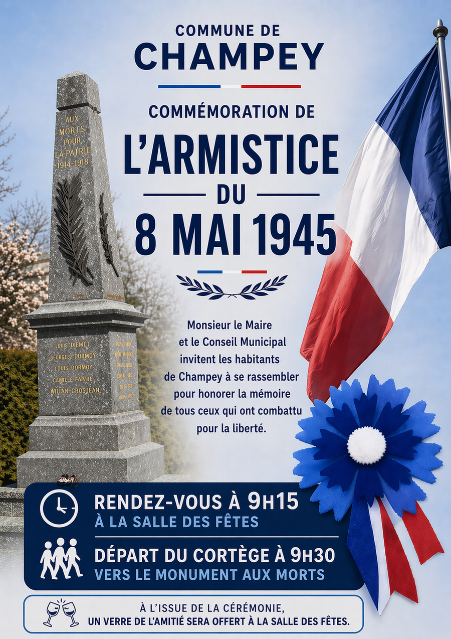 Les habitants de la commune et ceux qui le souhaitent sont conviés à la cérémonie de commémoration du 8 mai 1945 le 8 mai à 9h15 devant la salle des fêtes.