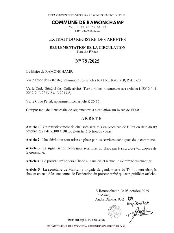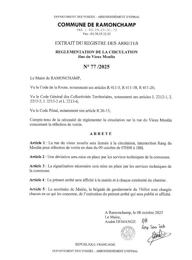 Réglementation de la circulation Rue du Vieux Moulin et Rue de l'Etat dans le cadre de travaux de réfection de chaussée.