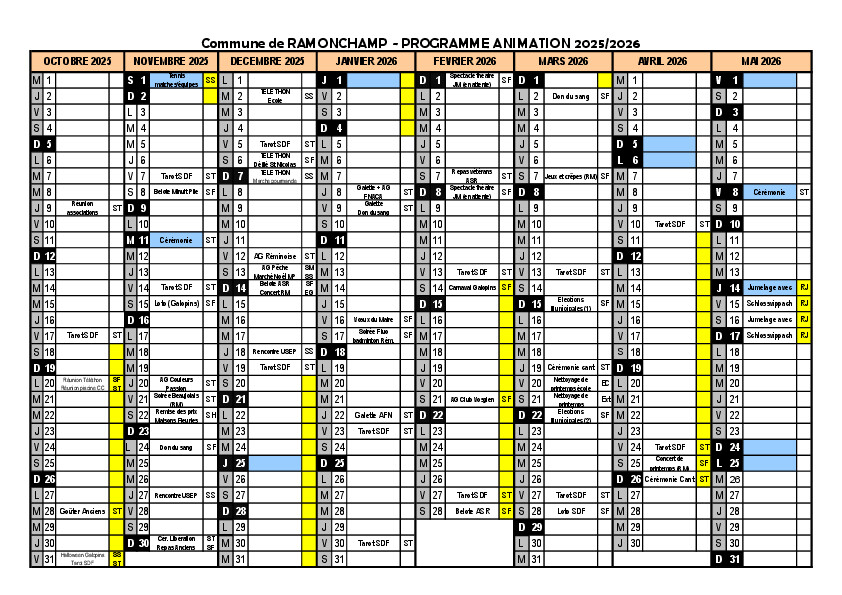 Suite à la réunion des associations du 9 octobre 2025, le calendrier des animations 2025/2026 a été élaboré entre le monde associatif et la commune.
