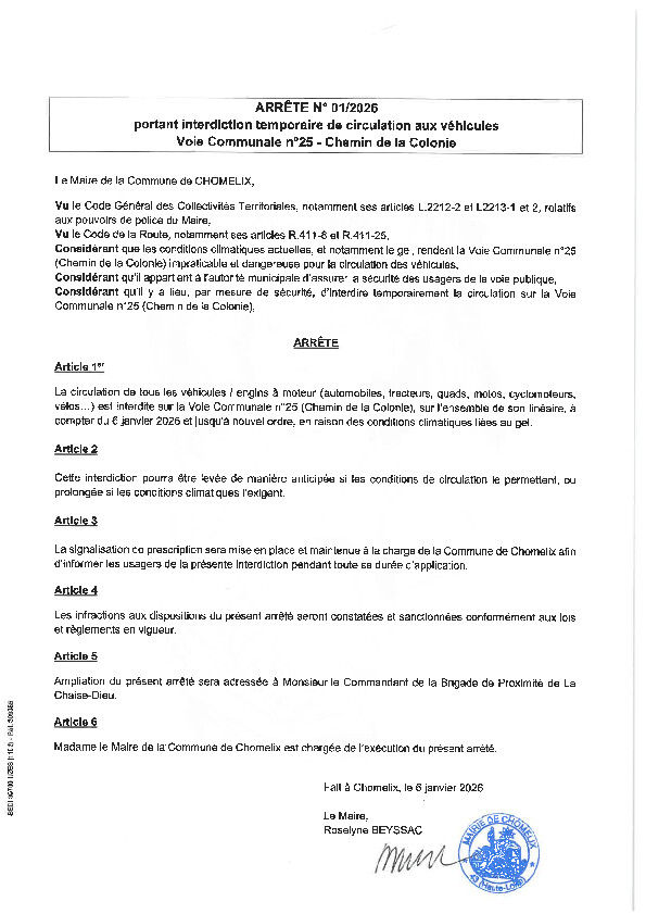 En application de l'arrêté municipal n° 01/2026 ci-joint.