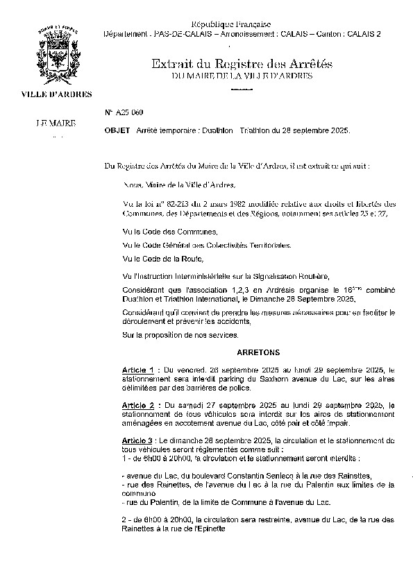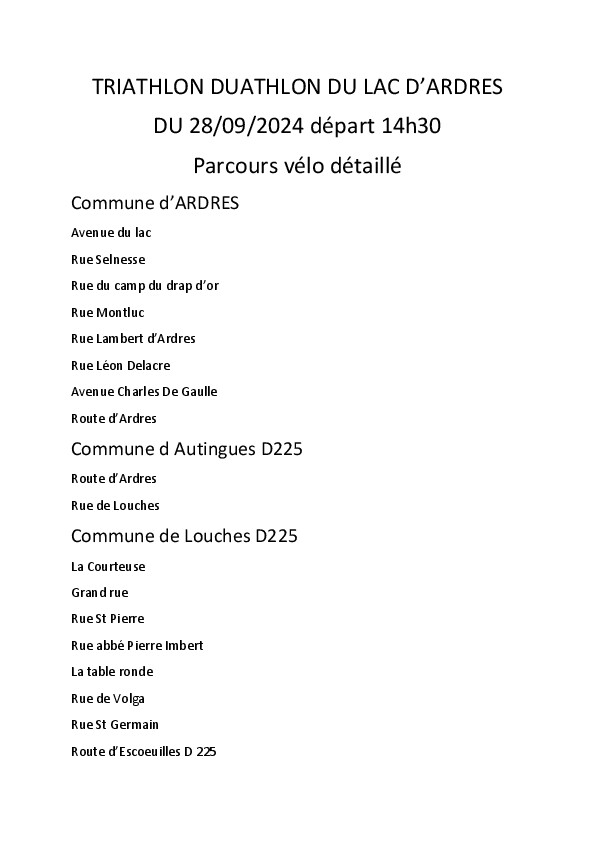 A l’occasion du Duathlon /Triathlon d’Ardres, le Dimanche 28 Septembre 2025, la circulation sera restreinte : RD225-Grand’Rue (en partie), RD 225 E3 Rue Saint Pierre, RD 225 E3-rue Abbé Pierre Imbert, Place de la Mairie, Rue de la Table Ronde, Rue du Volga, Rue Saint-Germain, RD 225 Route d’Escoeuilles, de 14 heures 00 à 17 heures 30.