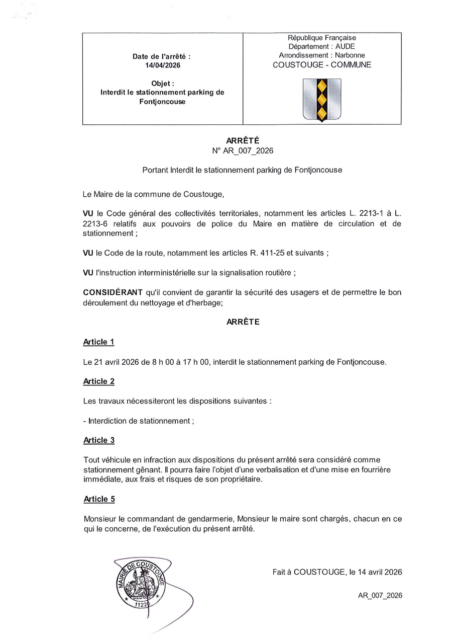 Le 21 avril 2026 de 8h00 à 17h00, interdit le stationnement parking de Fontjoncouse.