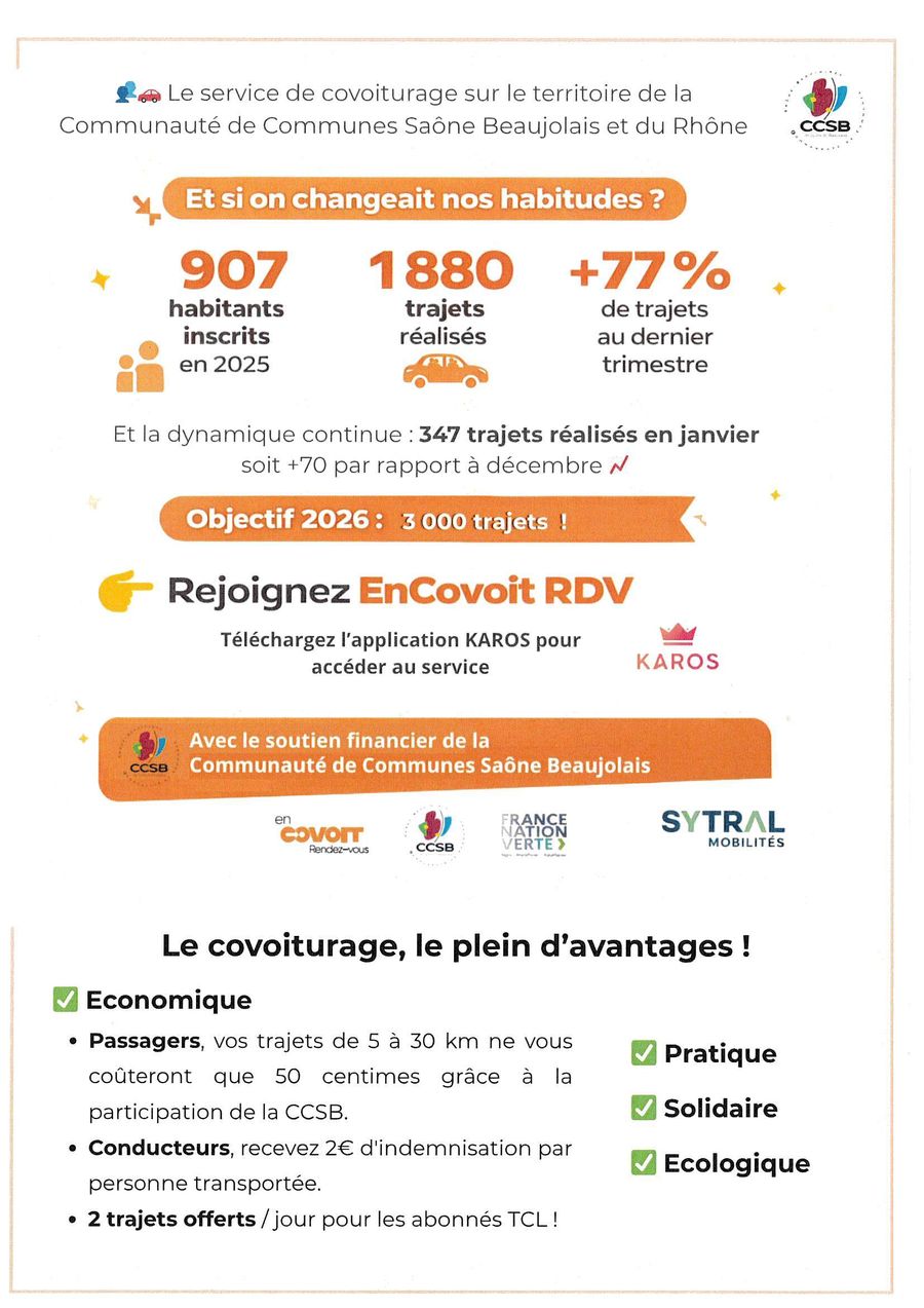 Le service de covoiturage du quotidien En Covoit’ Rendez-Vous continue de séduire sur le territoire de la Communauté de Communes Saône-Beaujolais !