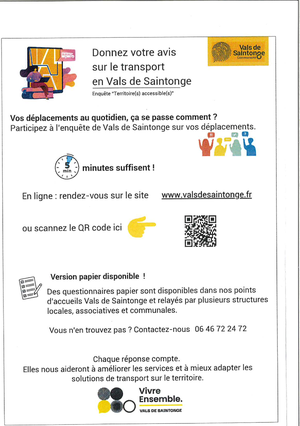 Cette enquête vise à recueillir des informations sur les modes de déplacement utilisés au quotidien et sur les trajets effectués en Vals de Saintonge, qu’ils concernent vos courses, vos loisirs, votre travail ou vos rendez-vous de santé. 🚘️🚲️