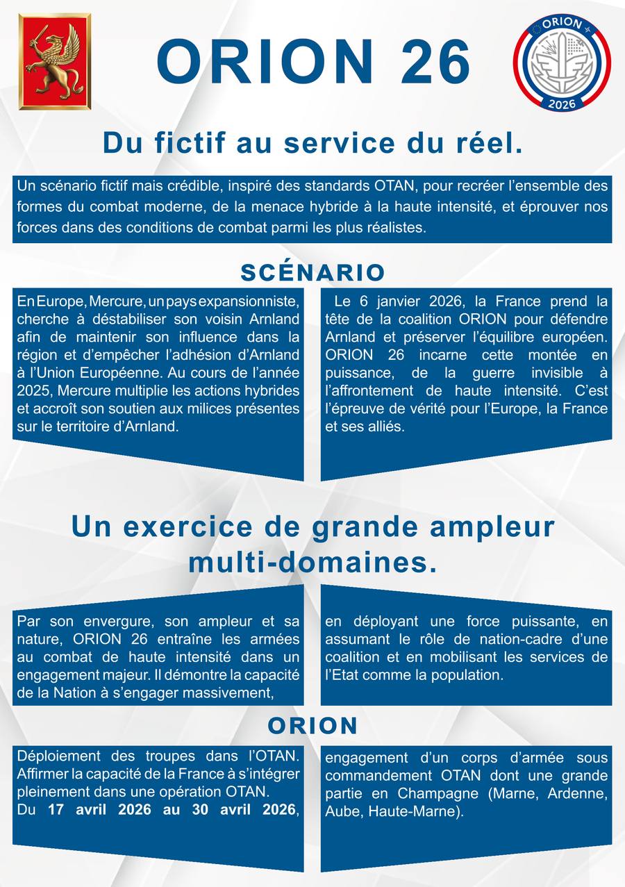 Se déroulant du 07 février au 30 avril 2026, sur 15 départements français, ORION 2026 engage les armées françaises dans un exercice interalliés, interarmées et multi-domaines de haute intensité.
