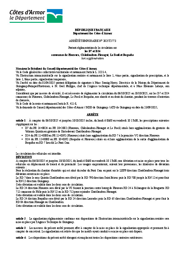 La route départementale de Quintin à Châtelaudren