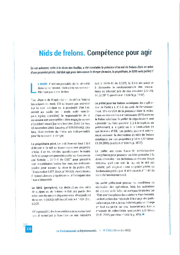 Qui doit agir par la destruction du nid : maire, propriétaire privé, SDIS ou Préfet ?