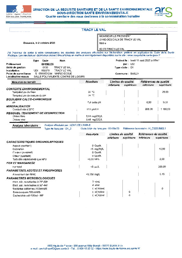 Les résultats des analyses effectuées à la ressource/captage et station de traitement sont envoyés à la personne responsable de la production et distribution de l’eau (PRPDE), ici le syndicat des eaux de Tracy-le-Val et son exploitant SUEZ.